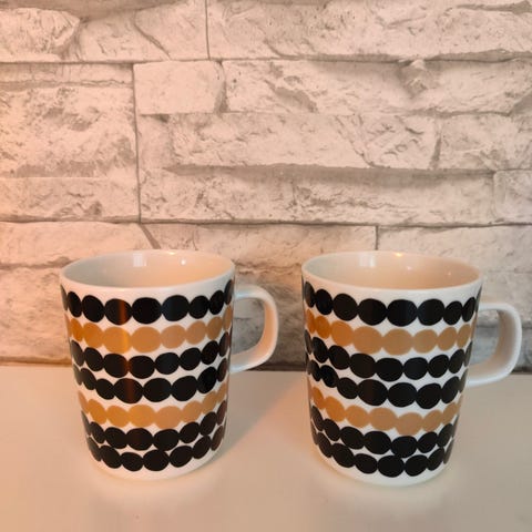 Marimekon hyvässä kunnossa olevat Siirtolapuutarha-mukit.
