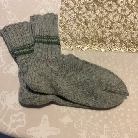 Neulotut villasukat, joissa sinimusta raitakuvio. Sukat ovat pitkävartiset ja joustinneulevarrella ja sopivat erinomaisesti kumikenkiin tai muihin pitkävartisiin jalkineisiin.