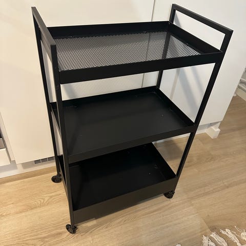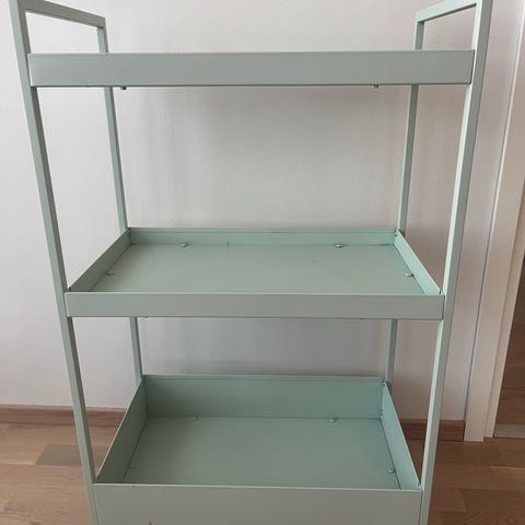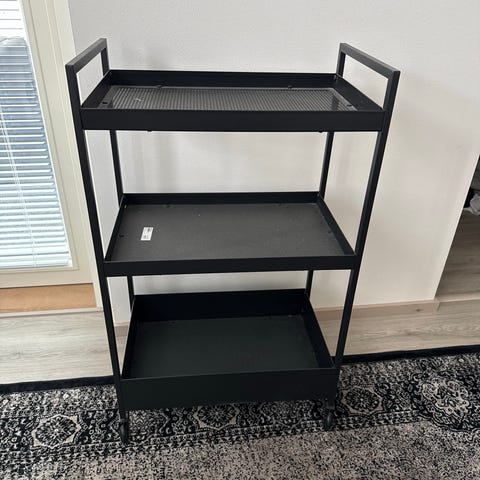 IKEA tarjoiluvaunu, kolmella tasolla. Materiaalina metalli, väri valkoinen. Ylin taso on ritiläpintainen, alemmat tasot umpipohjaisia.