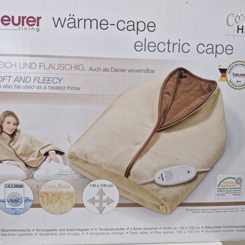 sähkölämmitteinen huopa harmaana. Pehmeäpintainen sähköhuopa, jossa on johdolla varustettu ohjain lämpötilan säätöön. Soveltuu lämmittämään käyttäjää esimerkiksi sohvalla tai sängyssä. Materiaali vaikuttaa olevan pehmeää tekstiiliä, väri vaalea harmaa. Tarkemmat tekniset tiedot, kuten teho, mitat ja lämpötila-asetusten määrä, eivät käy ilmi kuvasta.