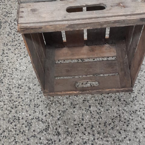 Puinen ruskea laatikko. Vanha, kuluneen näköinen puulaatikko, jossa tekstiä saksaksi kyljessä. Sopii esimerkiksi säilytykseen tai sisustuselementiksi. Mitat 45cm x 23cm. Hinta 30€ / kpl. Osta 2 niin hinta 50€ yht.