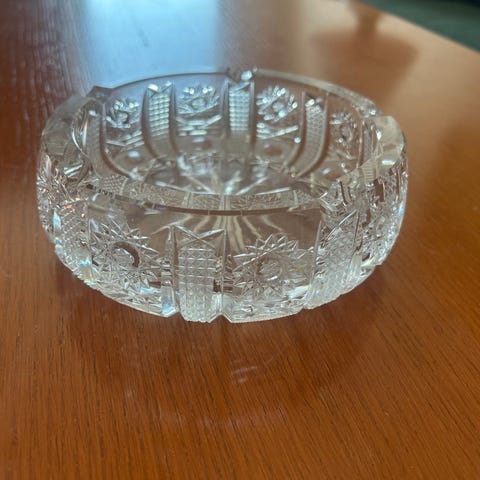 Lasinen kirkas tuhkakuppi. Pyöreä malli, jossa useita uria savukkeille reunoilla. Soveltuu sisä- tai ulkokäyttöön tasaisella alustalla. Helppo puhdistaa ja käyttää yleiskäyttöisenä tuhkakuppina.Hinta 5 euroa