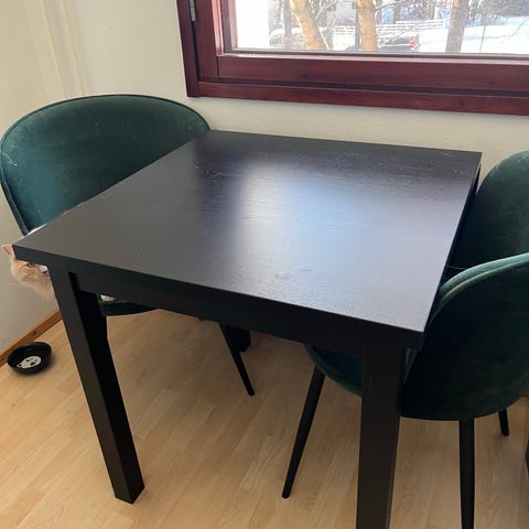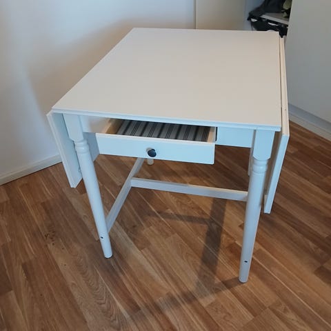 IKEA jatkettava klaffipöytä, jossa puunvärinen suorakulmainen pöytätaso 75 x 75 cm, jatkettuna 120 cm ja tummansiniset jalat. Pöydässä on alas laskettava jatkolevy, jonka avulla pöydän kokoa voi muuttaa tilan ja käyttötarpeen mukaan. Soveltuu esimerkiksi keittiöön, ruokailutilaan tai työpisteeksi. Materiaalina on puunvärinen levy ja puiset jalat tummansinisinä.