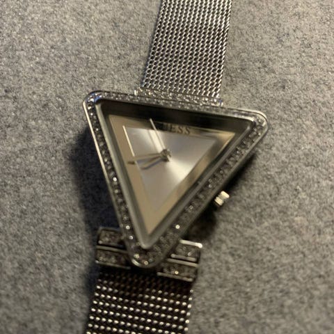 Guess naisten rannekello. Kellossa on hopeansävyinen teräsranneke ja hopea kellotaulu. Kellon kehällä on koristekiviä ja taulussa useita pienempiä lisänäyttöjä. Kuori ja takakansi ovat ruostumatonta terästä. Vesitiiveys on merkitty taakse (50 meters / 165 feet water resistant). Kello toimitetaan Guess-laatikossa.