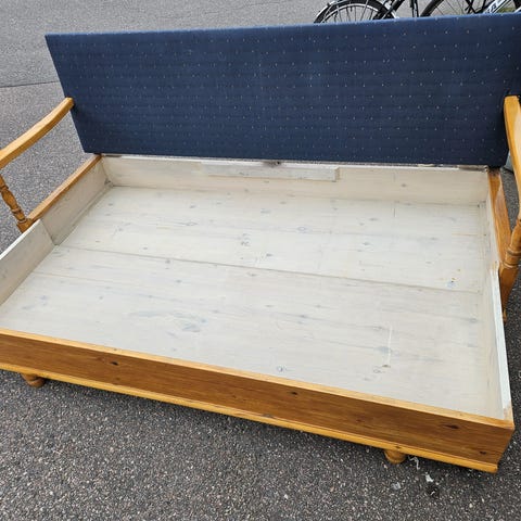 Yleisilme siisti, käytön jälkeä kuitenkin havaittavissa. Koiranpentu jyrsinyt vähän alalaatikon reunoja. Voinee hioa ja maalata siistiksi. Lisäksi vuoteen jalkopäästä katkennut yksi säleikön puu. Meillä ei ole haitannut käyttöä.