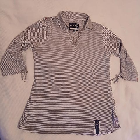 Pelle P t-paita, koko S. Väri sinivalko raidallinen. Materiaali puuvillaa. Lyhythihainen malli, jossa V-pääntie.
