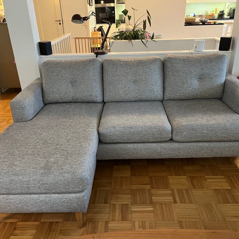 Jysk Falslev-kulmasohva harmaalla kangasverhoilulla. Selkänojassa on erilliset tyynyt ja istuimessa nappitikkaukset. Täysin ehjä, mutta värjäymiä päällysteessä. Divaanimalli jossa erillinen divaanijatke.