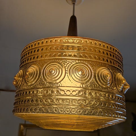Vanha kattovalaisin, jossa viisi lasista kupua(yksi korjattu).