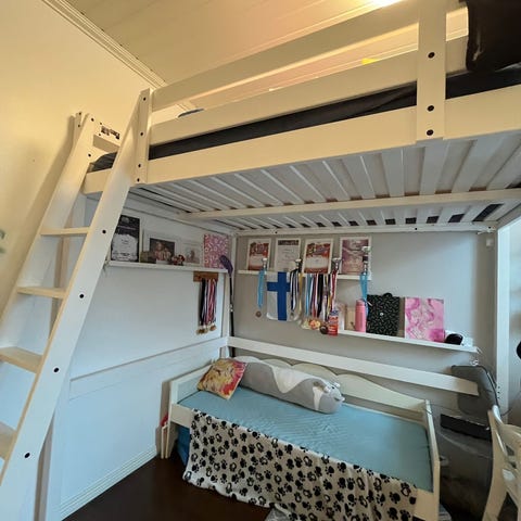 Ikea Storå Parvisänky, joka on mustaksi petsattu. Parvisänkyä madallettu 54 cm. Sängyn korkeus 160 cm, pohjasta 117 cm. Sängyn leveys 213 cm, syvyys ilman rappusia 152 cm. Madalluksesta johtuen sopii matalampaan huoneeseen. Sängyn alle jää vielä riittävä tila aikuiselle mm. istumiseen tuolissa, mutta soveltuu parhaiten lastenhuoneeseen tai mökille. Sänkyyn sopii 140 x 210 cm patja. Sängyn mukana tulee Ikea Sultan patja (15 cm paksu), sekä Sotkan petauspatja (8 cm paksu). Sänky ja Ikean patja arviolta noin 10 vuotta vanhoja (ostettu torista 5 vuotta sitten). Petauspatja noin 5 vuotta vanha. Sänky ollut meillä mökillä makuuaitassa viitisen vuotta satunnaisella vähäisellä käytöllä.