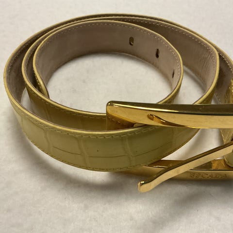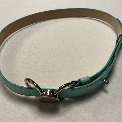 Edessä on iso LAUREL-solki. Vyön leveys on 2,5 cm. Oikealla taemmalla on tumma jälki. Muuten vyö on hyväkuntoinen.