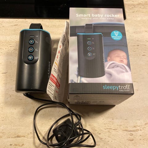 Myydään käytetty Sleepytroll-laite, joka keinuttaa rattaita automaattisesti ja auttaa lasta nukahtamaan.