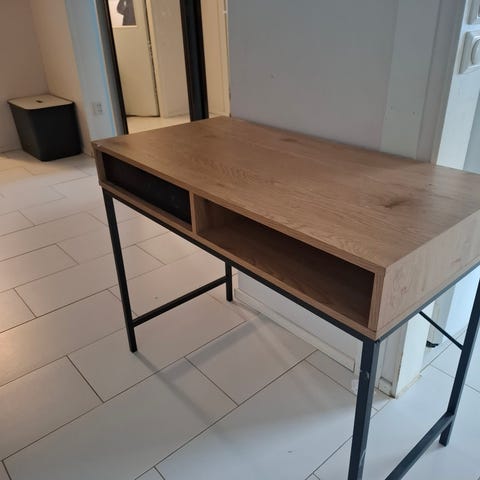 Kirjoituspöytä, jossa suorakulmainen puunvärinen pöytätaso ja valkoinen metallirunko. Pöydässä on yksi avohylly ja yksi laatikko säilytystä varten. Sopii esimerkiksi työpöydäksi tai opiskelupöydäksi pieneen tilaan.