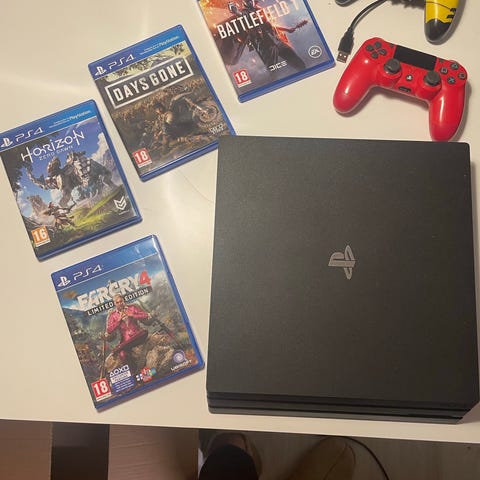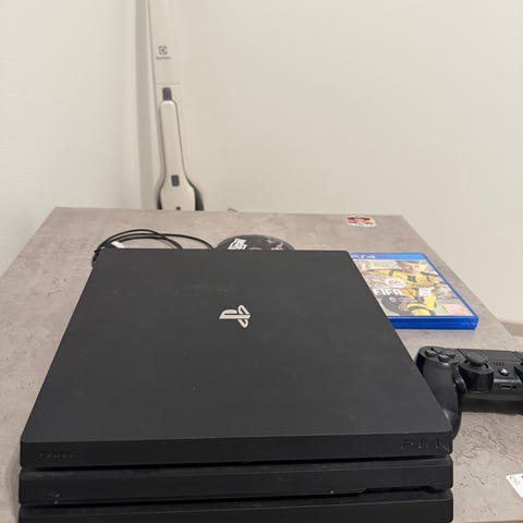 PS4 Pro Glacier White 1 TB + johdot (HDMI-kaapeli, virtajohto, USB-latausjohto ja ohjaimen kuulokkeet) + kaksi ohjainta (valkoisessa ohjaimessa pieni kosketushäiriö, vasen tappi viettää vasemmalle välillä) + ohjekirjat + laatikko.