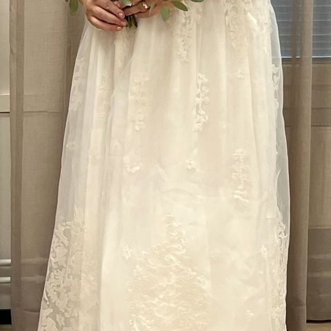 Ompelijalla teetetty uniikki hääpuku ja huivi. Hääpukua voi säätää nyöreillä. Tehty raskausvatsalle sopivaksi.