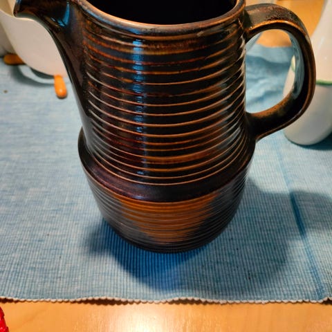 Arabia iso kannu keramiikkaa. Kannu on valkoinen ja siinä on punainen maisemakuvio molemmilla puolilla sekä punainen reunus suuaukon ympärillä. Korkeus on noin 28 cm ja leveys noin 20 cm (mitat käsin mitattuja ja suuntaa-antavia). Pohjassa on Arabian leima. Tarjoa hinta
