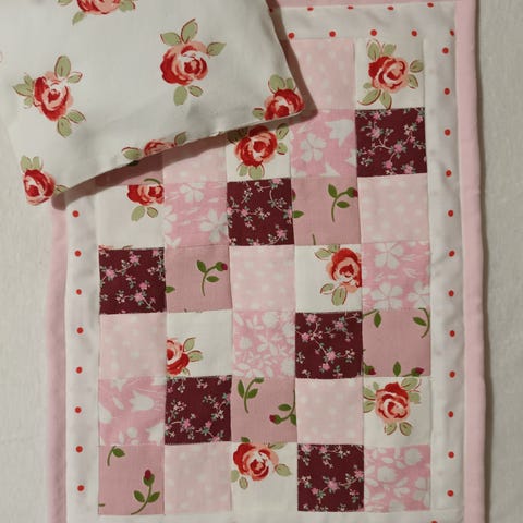 Nuken peitto+tyyny musliinikankaasta, molemmissa ohut vanukerros. Peituosettiin kuuluu myös solmupanta nukelle.