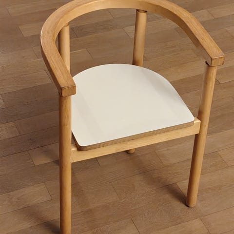 Artek lasten tuoli valkoiseksi maalattua puuta. Tuolissa on pyöreä istuin ja taivutetut jalat sekä selkänoja, joka tukee istujaa. Sopii lapsen istuimeksi esimerkiksi työpöydän ääreen tai leikkihuoneeseen. Kuvissa näkyy käytön jälkiä ja maalipinnan kulumaa joissakin kohdissa.