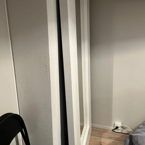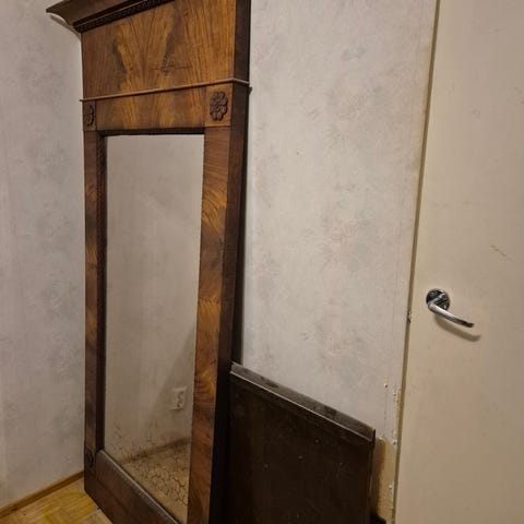 Vanha puinen iso peili. Merkki ei tiedossa. Mitat: kork 138,5cm / lev 78,5xm / syv 3,5cm