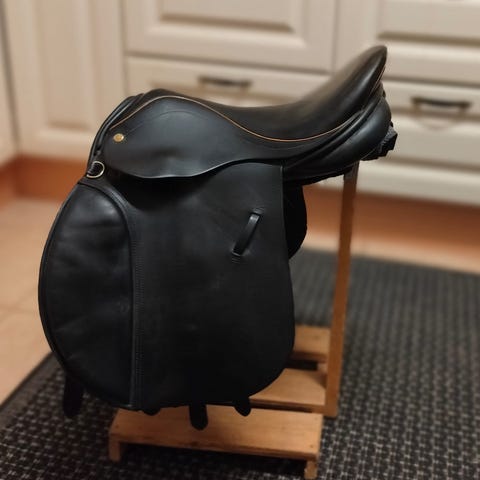 Barnsbyn koulupainotteinen yleissatula, ehjä vaikkakin vuosia ollut käytössä. Istuimen saumat joskus irvistäneet, satulaseppä paikannut liimalla, vastinhihnat hyvässä kunnossa. Nouto Vantaalta tai Vihdistä. 16,5".