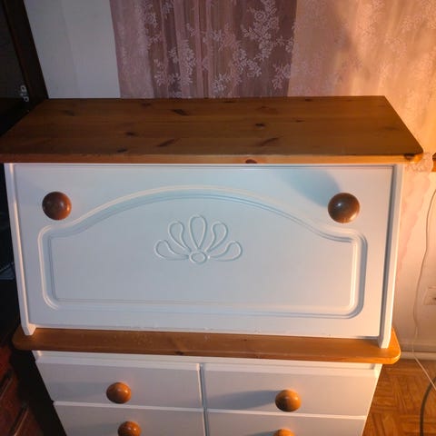 50-luvun klaffilipasto kolmella vetolaatikolla ja ulosvedettävällä pöytätasolla. Lipaston sisällä lokerikoita ja kolme pientä vetolaatikkoa. Yksi avain.