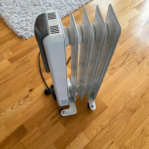 Energy öljytäytteinen sähkölämmitin valkoinen. Liikuteltava patterimallinen lämmitin, jossa useita lamelleja ja pyörillä varustettu jalusta. Laitteessa on kantokahva, virtakytkimet ja lämpötilansäädin. Soveltuu lisälämmönlähteeksi sisätiloihin, kuten asuntoihin, mökille tai työhuoneeseen. 15oow. Korkeus 55cm,pituus 35cm.