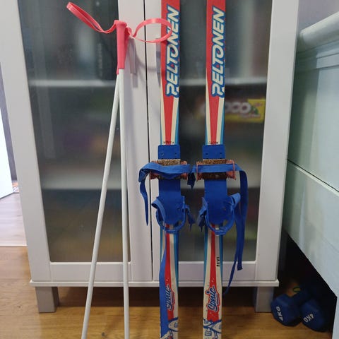 Fischer 135cm sukset, Salomon SNS siteet. Suksissa kolhuja, mutta pohjat ja siteet ehjät.