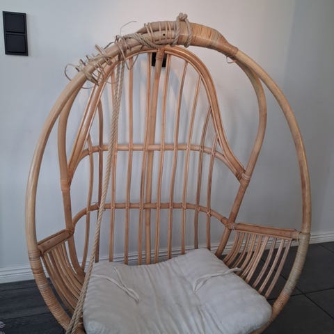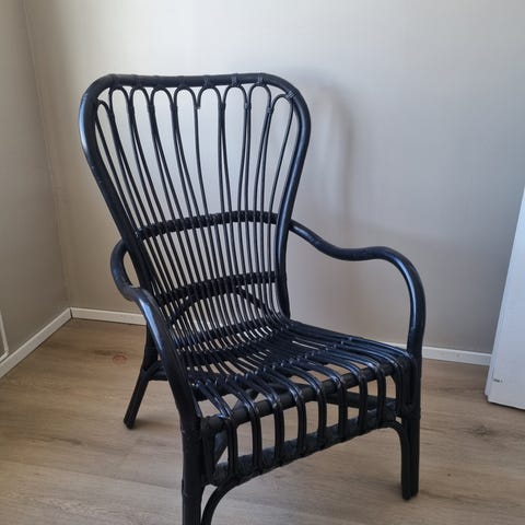 Pyörivä vaaleanpunainen rottinkituoli mustalla päällisellä