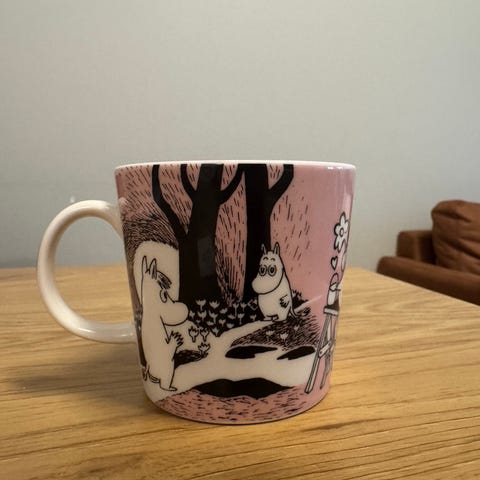 Arabia Muumi -sarjan keramiikkamuki, jossa on sininen pohjaväri ja Muumi-hahmojen kuvitus. Muki sopii kuumille ja kylmille juomille arki- ja kahvihetkiin. Valmistettu lasitetusta keramiikasta, jossa on korvalla varustettu perinteinen mukin muoto. Pohjassa Arabia Finland -leima ja Muumi-kuvitusmerkintä.