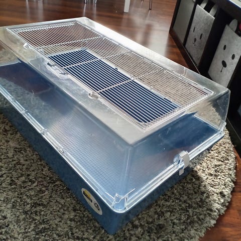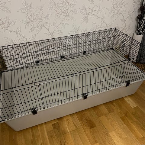 Hyvässä kunnossa. Mukaan saa tavaroita ja kuljetusboksin sekä purua.