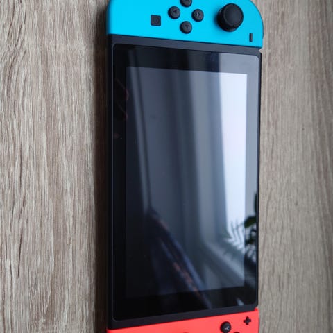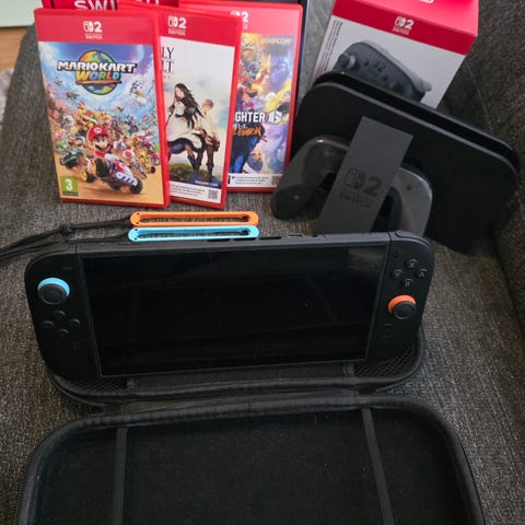 Nintendo Switch -pelikonsoli. Mukana kaikki härpäkkeet, orkkisboksi löytyy. Suojalasi asennettu, löytyy myös suojakotelo