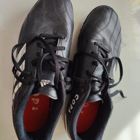 Adidas Kaiser 5 jalkapallokengät, koko 41 1/2 US 8.Väri musta valkoisilla raidoilla ja ruskealla pohjalla. Kengissä nauhakiinnitys ja matala varsi. Soveltuvat jalkapalloon, erityisesti sisä- tai koville alustoille. Materiaali vaikuttaa olevan nahkaa tai nahkajäljitelmää yhdistettynä synteettisiin osiin. Kengissä perinteinen Adidas-malli ja Kaiser 5 -merkintä sivussa.
