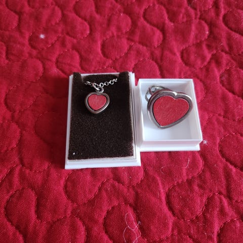 Aarikan siistikuntoiset Carmen-sarjan sydänkorut: kaulakoru 41 cm ketjulla ja korvakorut hopeisilla koukuilla.