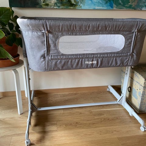 Moweo-merkin käytännöllinen sivuvaunusänky pehmeällä, topatulla patjalla. Pakkaukseen sisältyy näppärä säilytyslaukku. Sängyssä on tyylikkäät, puiset jalat, jotka antavat sille modernin tyylikkään ilmeen.