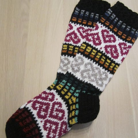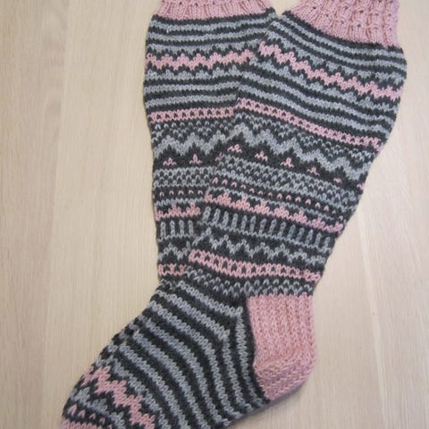 kuvan villasukat, koko 39, jalkaterän pituus 24 cm, varren pituus kantapäästä 32 cm, käsityönä kudottu, Seitsemän veljestä langasta, konepestävät, uudet