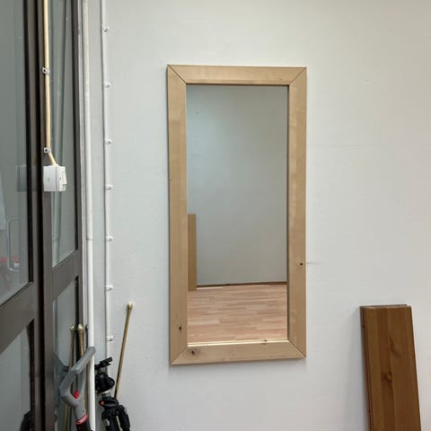 Annetaan puinen seinäpeili. Puinen kehys. Mitat 106cm x 46 cm.
