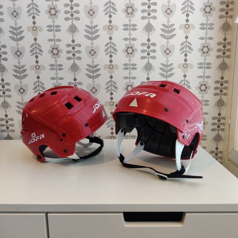 Jofa jääkiekkokypärä sininen. Kypärässä on kovamuovinen ulkokuori ja pehmustettu sisäosa, joka koostuu useista erillisistä pehmustepaloista. Kypärässä on ilmanvaihtoaukkoja päällä ja takana sekä säädettävä leukahihna. Takana on heijastava kolmionmuotoinen merkki parantamaan näkyvyyttä. Soveltuu jääkiekkokäyttöön ja muuhun luisteluun käyttäjän koon mukaan.