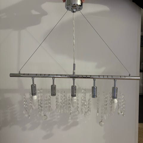 Kaunis kattovalaisin. Kaikki ”kristallit” ehjiä ja tallella, muovisia ovat. Halutessaan mukaan saa polttimon (+kaukosäätimen), josta saa kaukosäätimen avulla vaihdettua väriä, kirkkautta jne.