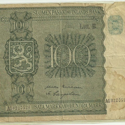 Suomen Pankki 100 markkaa seteli 1939 Liit.D No B-4075164