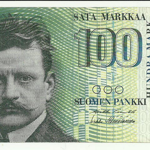 Suomen Pankin 100 markan seteli 1939 Liit.D. Toisella puolella ihmishahmoja ja maisemaa, toisella puolella Suomen vaakuna ja lehväkoristeet. Soveltuu esimerkiksi keräilyyn tai numismatiikkakokoelmaan. Ristitaitos, käsittelyn jälkiä hinta 6 e posti 2.50 e