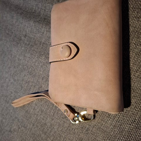 Pieni mainoskukkaro, jossa lukee: Lounais-Suomen Säästöpankki Vaskion konttori 30v. Mielestäni nahkaa. En usko, että on ollut käytössä lainkaan, koska kultainen teksti ei ole yhtään kulunut ja kukkaro näyttää muutenkin kaikin puolin siistiltä.