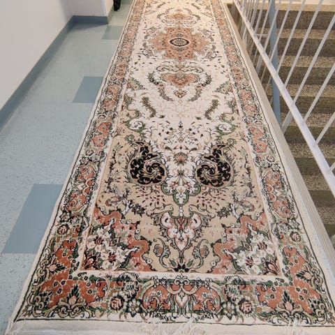 IRANILAINEN käytävämatto, jossa perinteinen kuviollinen pinta ruskean ja beigen sävyissä. Matto on pitkä ja kapea, sopii esimerkiksi käytävään tai eteiseen. Materiaalitietoja on viimeisessä kuvassa, matto on kudottu ja siinä on koristereunus koko maton ympäri. Soveltuu sisäkäyttöön kodin eri tiloihin.