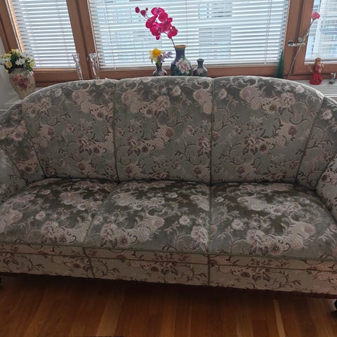 Chippendale tyylin hyväkuntoinen samettiverhoiltu tuoli kukkakuviolla. Tukeva istuinasento, kauniit koristeet ruskeassa puussa.