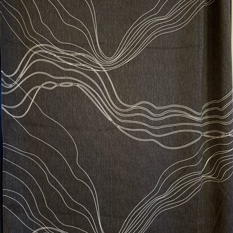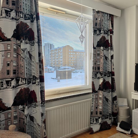 Vallilan metsäinen pimennysverho, pituus 230cm, itse lyhennetty, ei tupakointia tai lemmikkejä asunnossa.