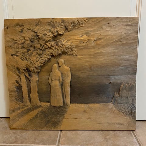 Asikainen seinätaulu puuta. Teoksessa on puuviilusta tehty kasvoaiheinen kuviointi, jossa käytetään eri sävyisiä puulajeja. Taulu on upotettu leveään, tummasävyiseen puukehykseen. Sopii sisustuselementiksi esimerkiksi olohuoneeseen, työhuoneeseen tai mökille. Taulussa on taiteilijan signeeraus "Asikainen".
