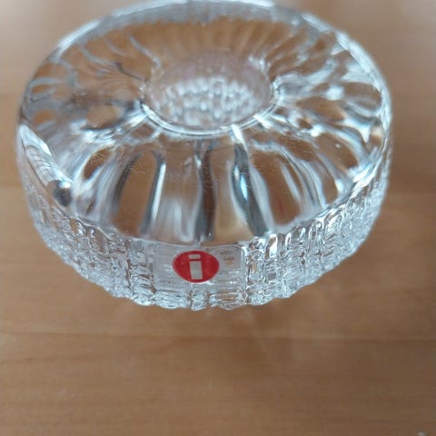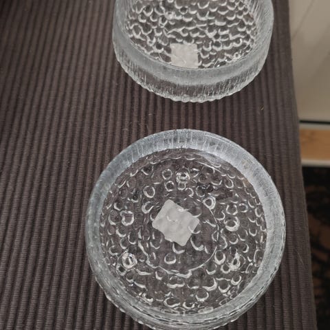 Kirkas lasikulho, jossa on kohokuvioitu pinta. Kulho on pyöreä ja matalahko, sopii esimerkiksi tarjoiluun tai koristekäyttöön. Kuvasta mitattuna halkaisija on noin 20–25 cm. Materiaalina on läpinäkyvä lasi, jossa on epätasainen, jääpintaa muistuttava rakenne ulkopinnalla ja pohjassa. Hp 30e