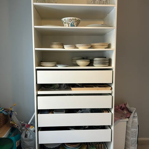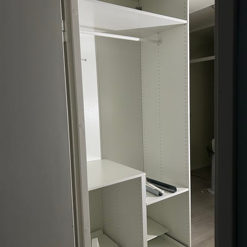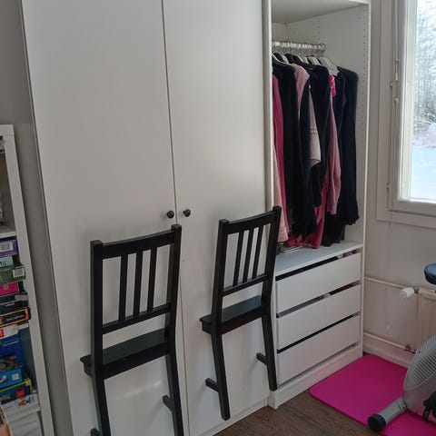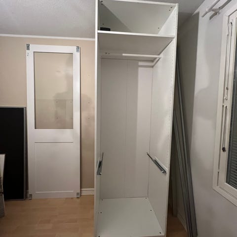 Myydään korkea ikea pax kaappi hyllyillä. Kaappi kiinnitetty seinään, joten muutama ylimääräinen reikä sisuksesta löytyy, näkyy kuvassa.