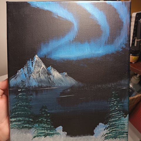 Itse maalattu Bob Ross tyylinen maisema maalaus. Tehty akryylimaaleilla ja on kooltaan 12x18cm. Maalauspohjalle tehty.