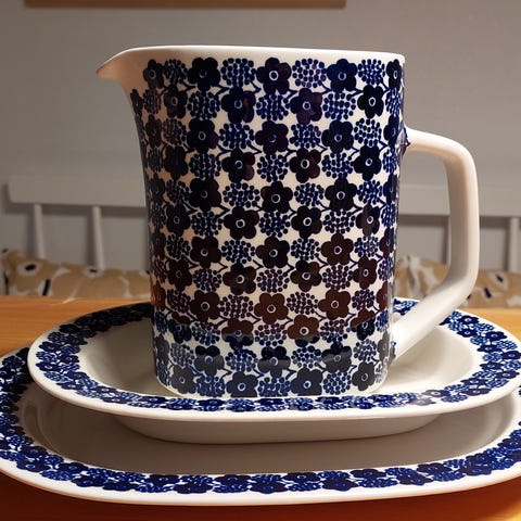 Ensimmäisen kuvan keskimmäinen, syvä Arabian tarjoilulautanen. Koko: 24,5cm x 17cm.