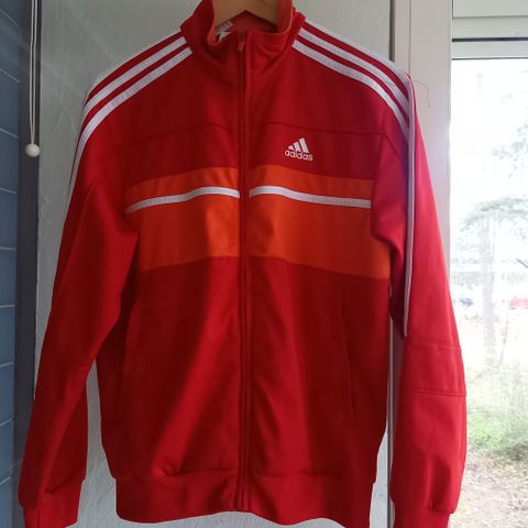 Edessä vetoketju ja lanteilla vetoketjulliset taskut. 3 raitaa käsivarsien ulkosivuilla molemmissa hihoissa. Mitat otettu vetoketju kiinni: o-h 66 cm, k-k 2 x 46 cm - 62 cm, hiha 54 cm.