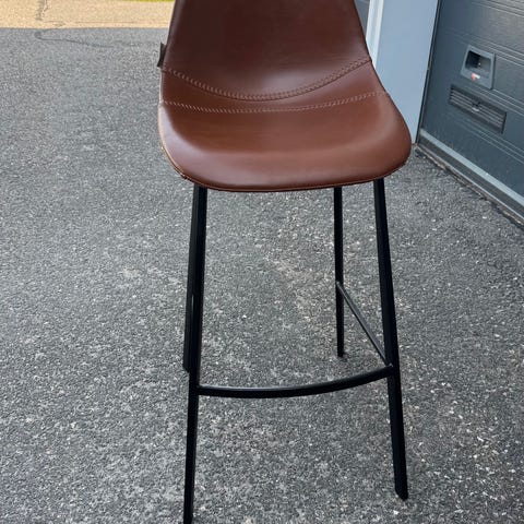 Dutchbone baarituoli, jossa ruskea keinonahkaverhoilu ja musta metallirunko. Istuimessa on kevyesti muotoiltu selkänoja ja tikkaukset. Jalat ovat kapeat ja suorat, ja niissä on poikkituki jalkojen lepuuttamista varten. Sopii esimerkiksi keittiön saarekkeelle tai baaripöydän ääreen. 100 e/ kpl 4 tai 5 kpl saatavilla